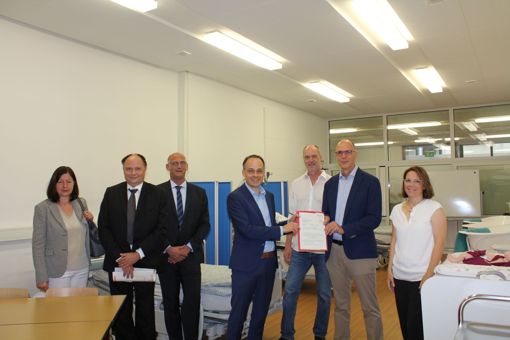 (v.l.) A. Deutscher, W. Kuckuk (beide MWG RLP), Prof. Dr. J. von der Heide (HWG LU), Staatssekretär Dr. D. Alt (MWG RLP), Dekan Prof. Dr. H.-U. Dallmann, Hochschulpräsident Prof. Dr. G. Piller und Prof. N. Knape (alle drei HWG LU) bei der Übergabe des Förderungsbescheids, im Hintergrund das Skills Lab mit dem Nachbau einer Wochenbettstation